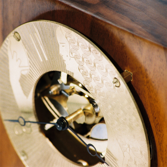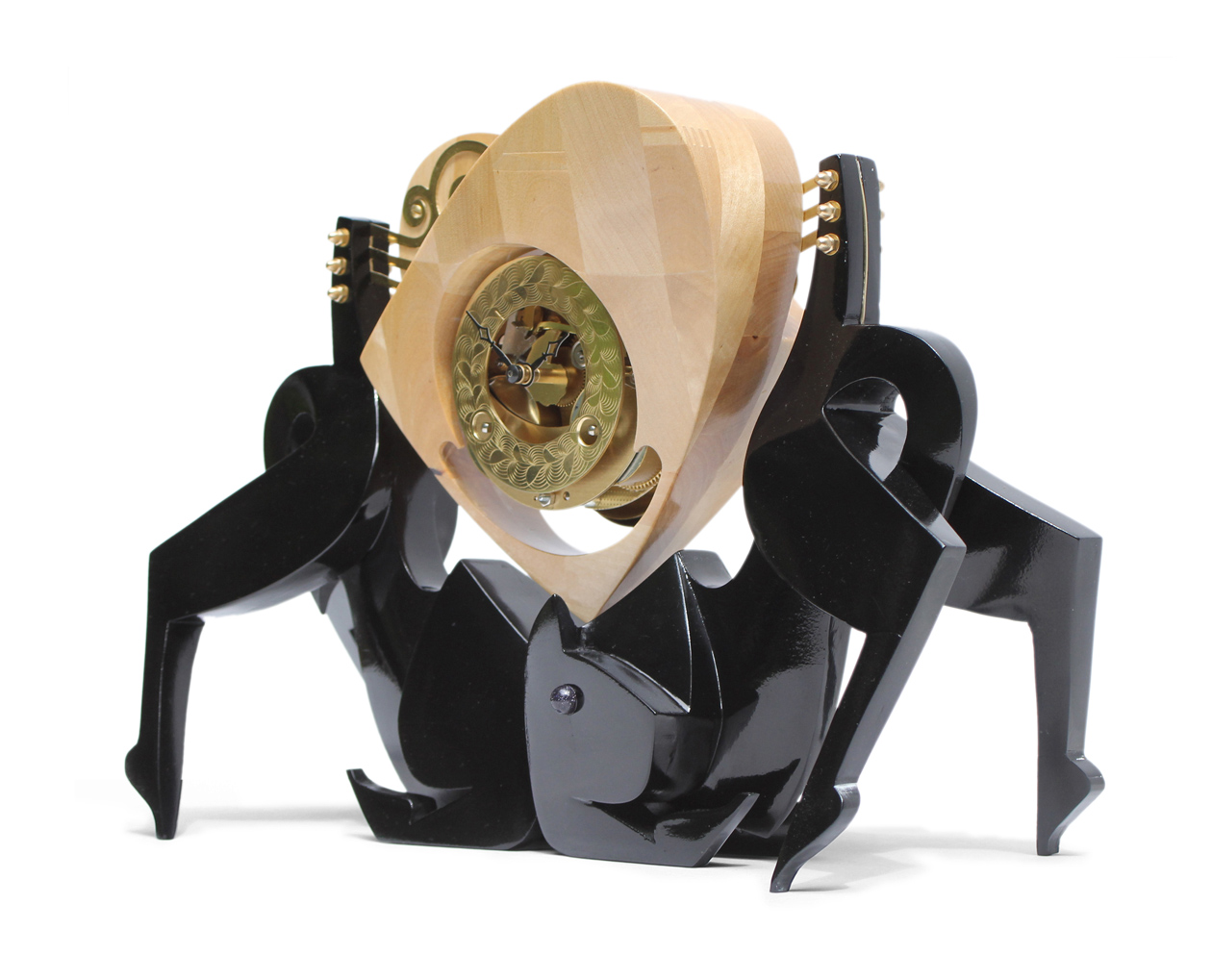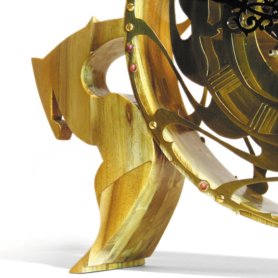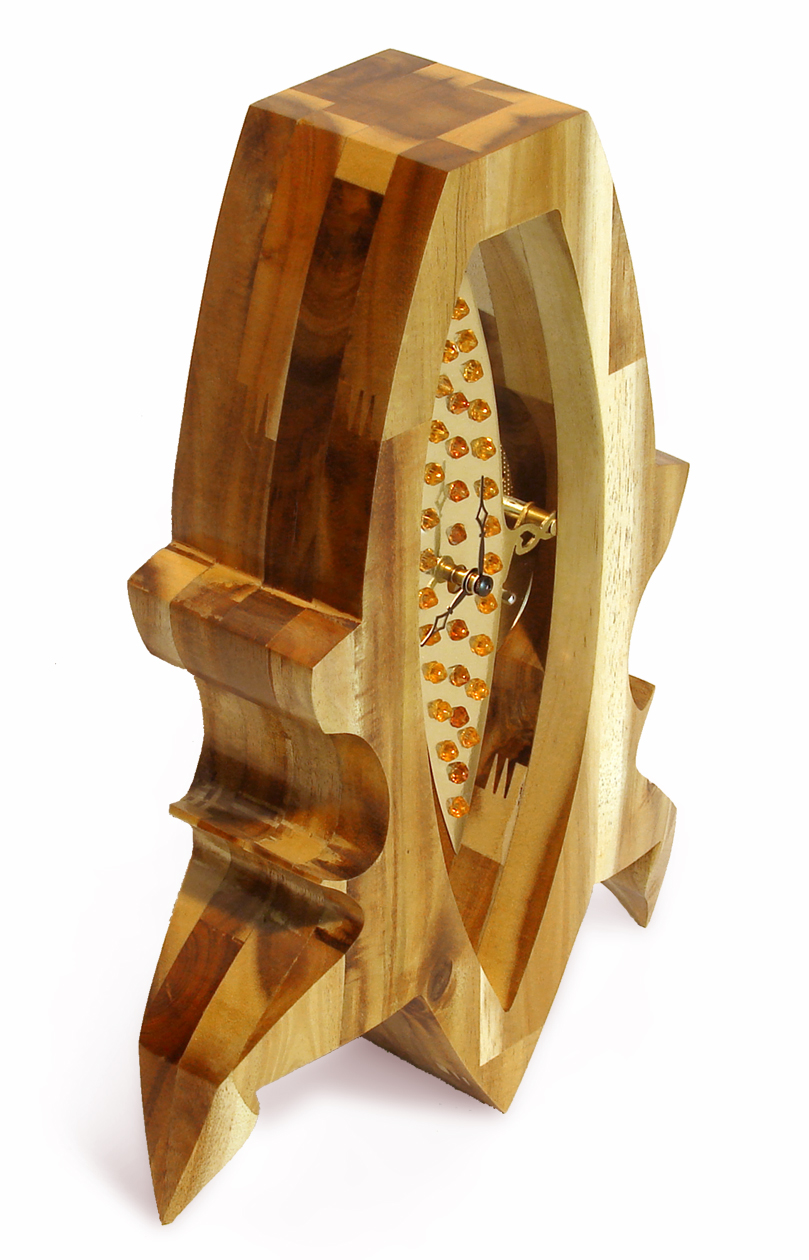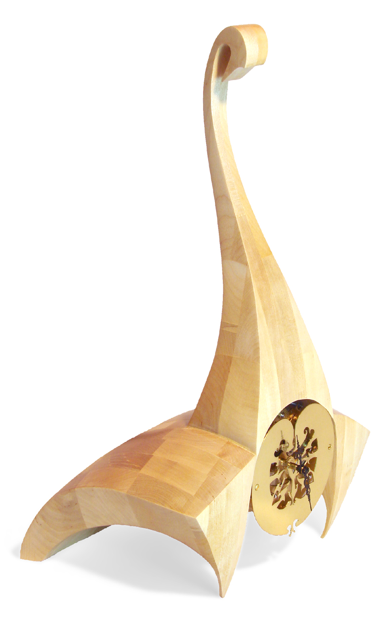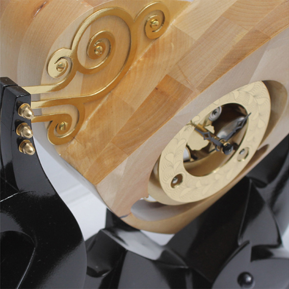 Allegorical clock Tre grazie – A profile of a modern woman: Body made of three selected laminated woods – oak, acacia and brich; fine cutout brass clock rosete; ACAD graved clock lunete; 8-days winding clock mechanism Hermle, Grosheim, Germany; clock hands type Breguet of blue gold. (dim.: 44/16/45 cm)