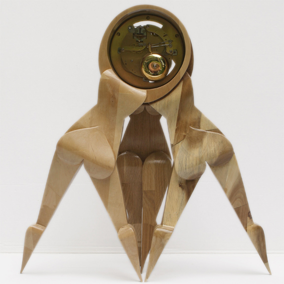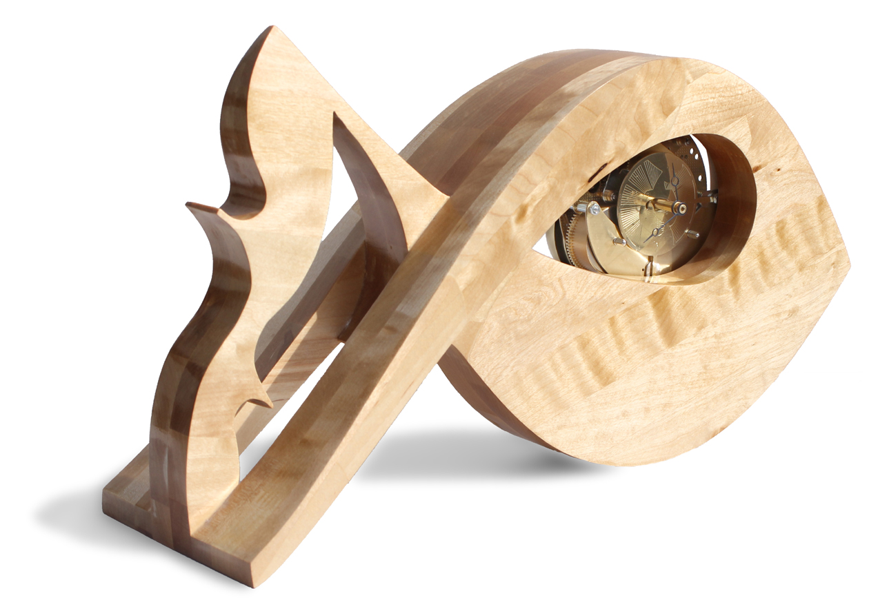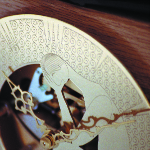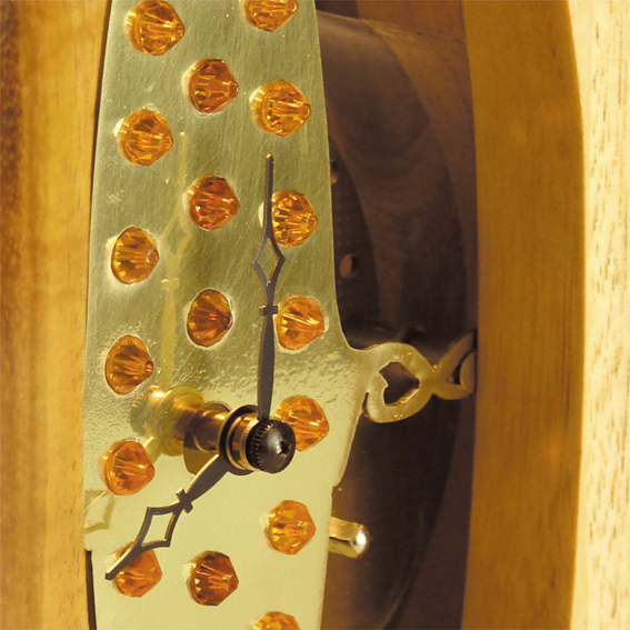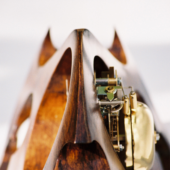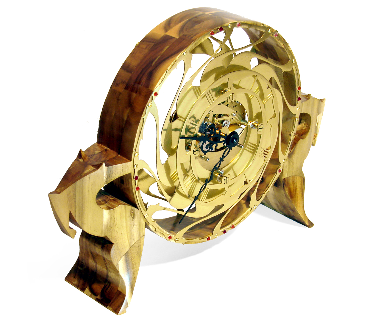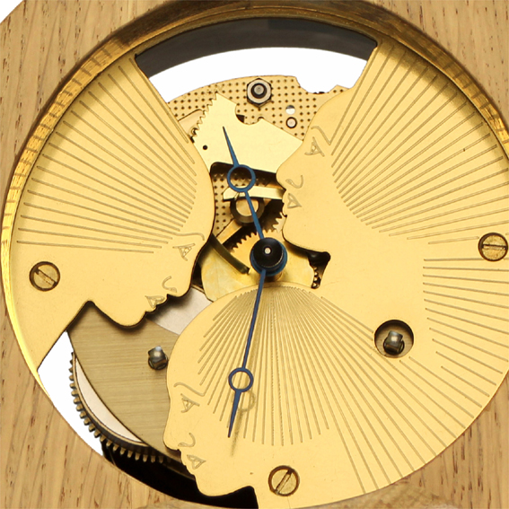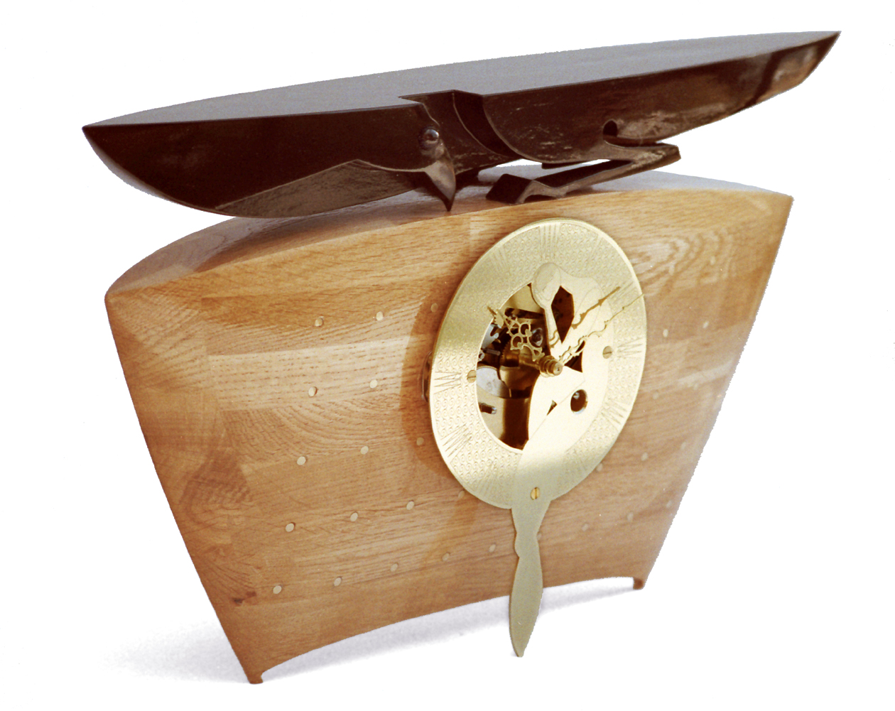 Allegorical clock Tre grazie – A profile of a modern woman: Body made of three selected laminated woods – oak, acacia and brich; fine cutout brass clock rosete; ACAD graved clock lunete; 8-days winding clock mechanism Hermle, Grosheim, Germany; clock hands type Breguet of blue gold. (dim.: 44/16/45 cm)
