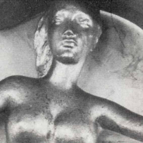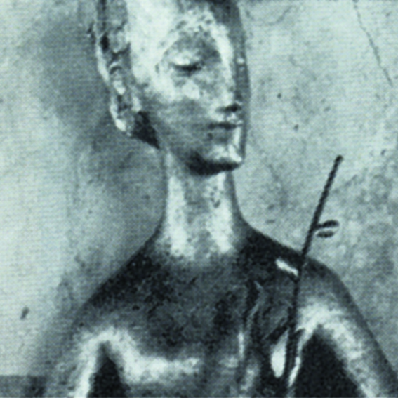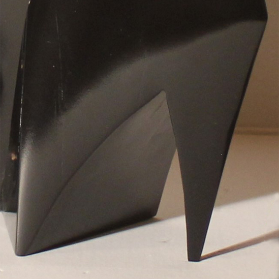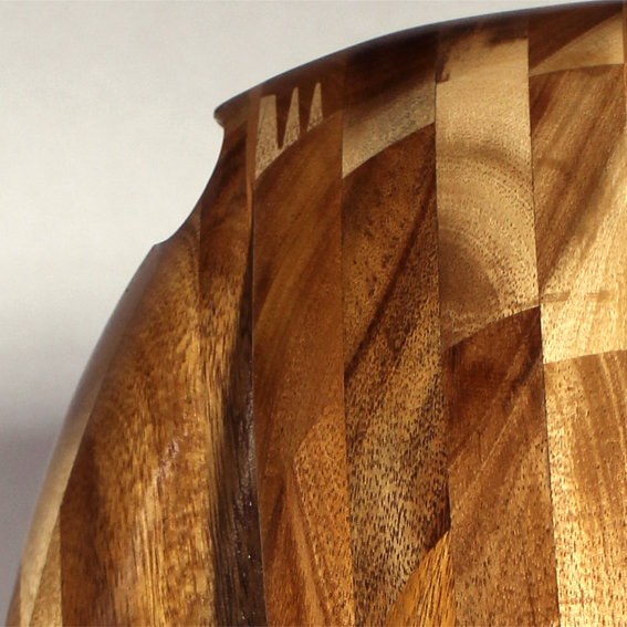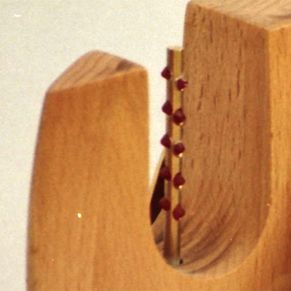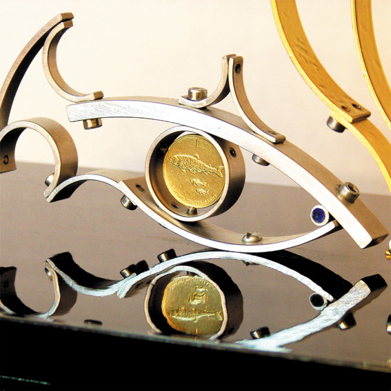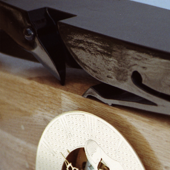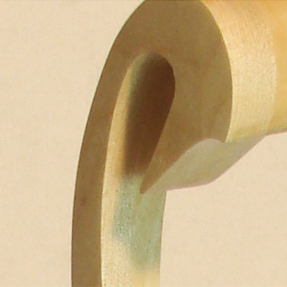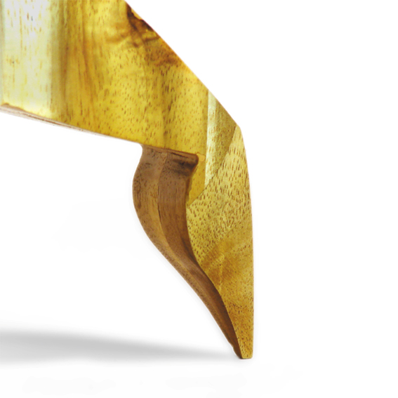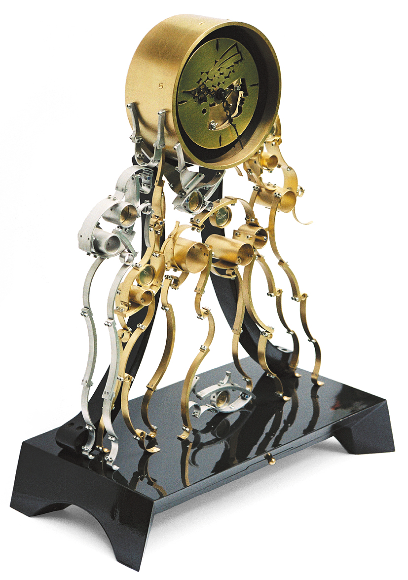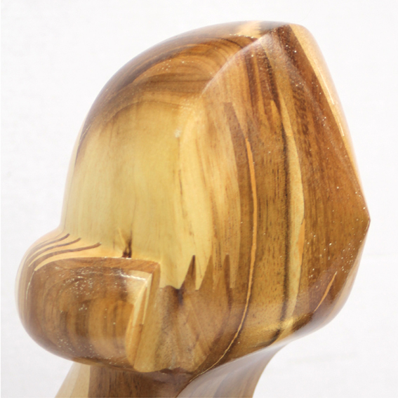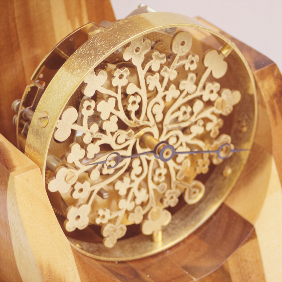 Allegorical clock Tre grazie – A profile of a modern woman: Body made of three selected laminated woods – oak, acacia and brich; fine cutout brass clock rosete; ACAD graved clock lunete; 8-days winding clock mechanism Hermle, Grosheim, Germany; clock hands type Breguet of blue gold. (dim.: 44/16/45 cm)